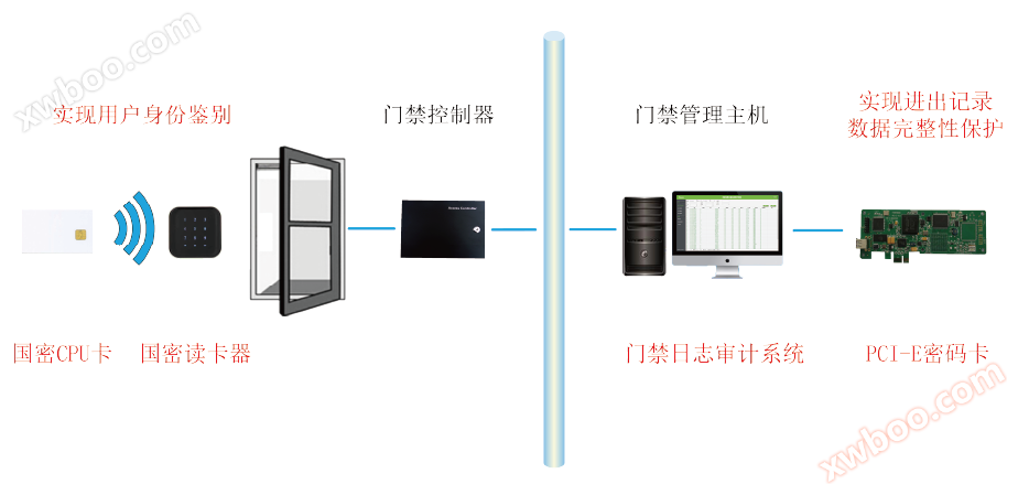 Among them, the national security CPU card and the national security door card reader adopt a challenge/response mechanism based on the SM1/SM4 national security algorithm to achieve user identity authentication. PCI-E password card (used in conjunction with the access control log audit system) adopts the SMC mechanism based on SM3 to achieve integrity protection of electronic access control entry and exit record data.