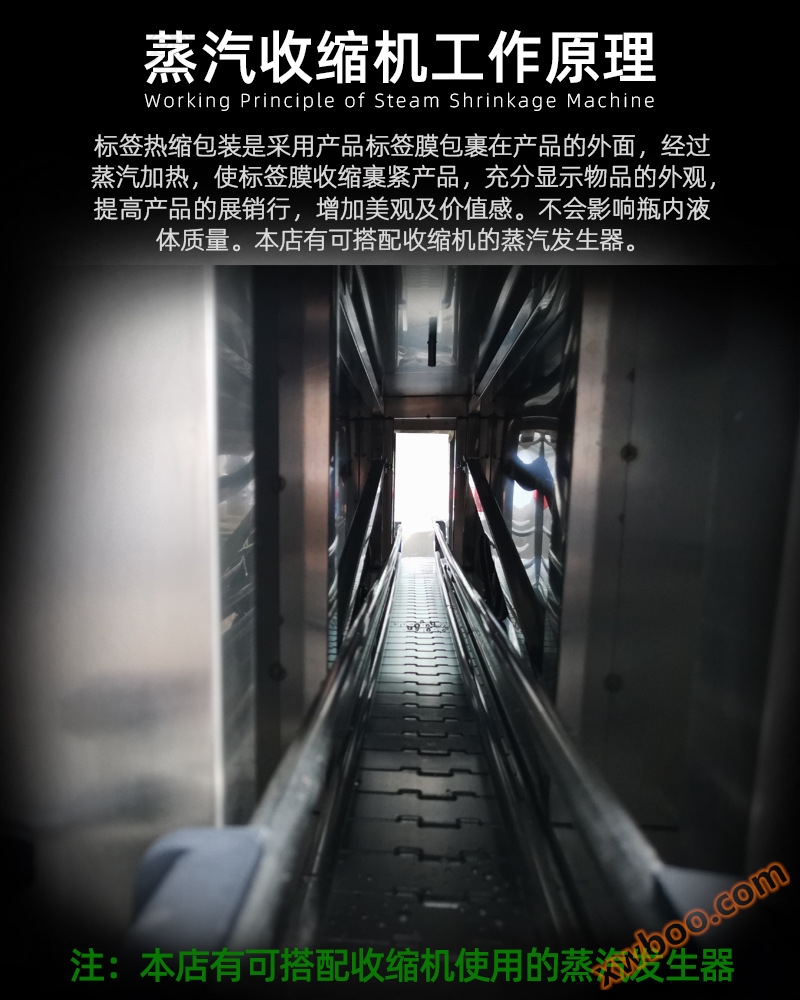 The workflow usually involves first placing the product into pre processed packaging materials, and then sending it into a shrinkage chamber filled with high-temperature steam through a conveying device. Under the action of steam, the packaging material rapidly shrinks and tightly adheres to the surface of the product.