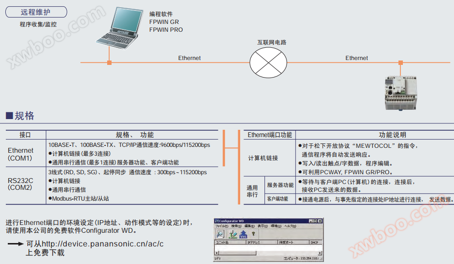 Maximum 2 channels for communication portsThe main body is equipped with an RS232C programming port. In addition, L40MR and L60MR also have built-in RS485 communication ports. Modbus-RTUIt can easily communicate with globally recognized industry standard Modbus RTU (binary) devices without programming. Such as temperature controllers and frequency converters. PLC connectionIf L40MR and L60MR are used, bit/word data sharing can be achieved among up to 16 PLCs. computer connectionIt can easily communicate with Panasonic's open protocol "MEWTOCOL" devices without any program. Such as displays, image processing devices, thermostats, power meters, etc. Universal Serial CommunicationGenerate/send corresponding instructions based on the communication protocol of the other device. In addition, it can also receive mobile data such as measuring instruments, barcode readers, RF-ID, etc.